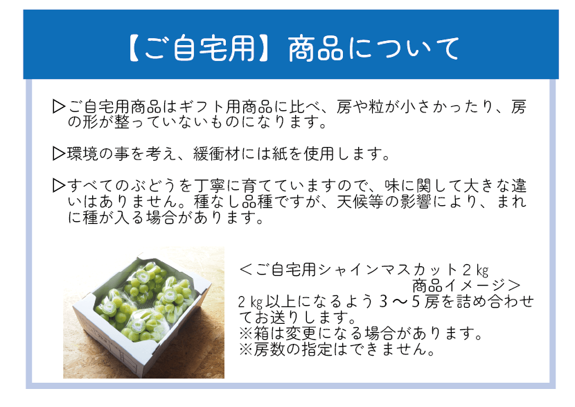 ご自宅用商品はギフト商品に比べ、房や粒が小さかったり、房の形が整っていないものになります。