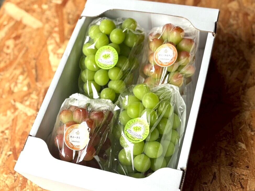 サニードルチェはシャキシャキとした食感で青リンゴのような味と香り、シャインマスカットは甘くてジューシーな味わいが特徴で、どちらも皮ごと食べられるぶどうです。