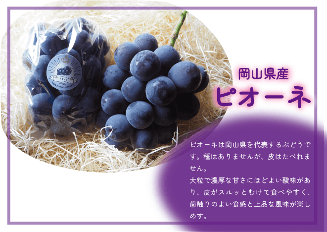 ピオーネは岡山を代表するぶどうです。大粒で濃厚な甘さにほどよい酸味があり、皮がスルッとむけて食べやすく、歯触りのよい食感と上品な風味が楽しめます。