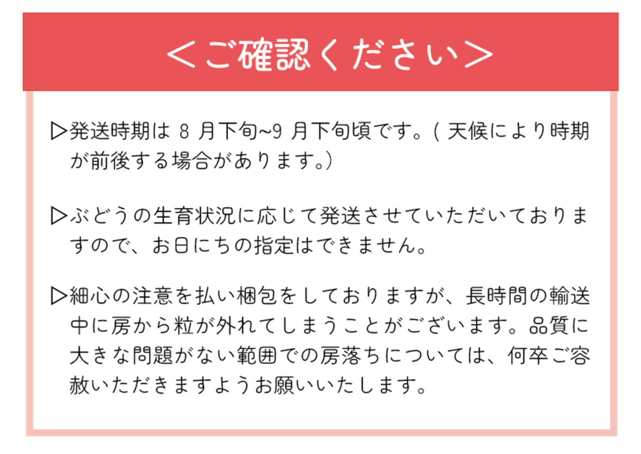 ・ぶどうの生育状況、天候によってお届けまでにお時間をいただく場合がございます。