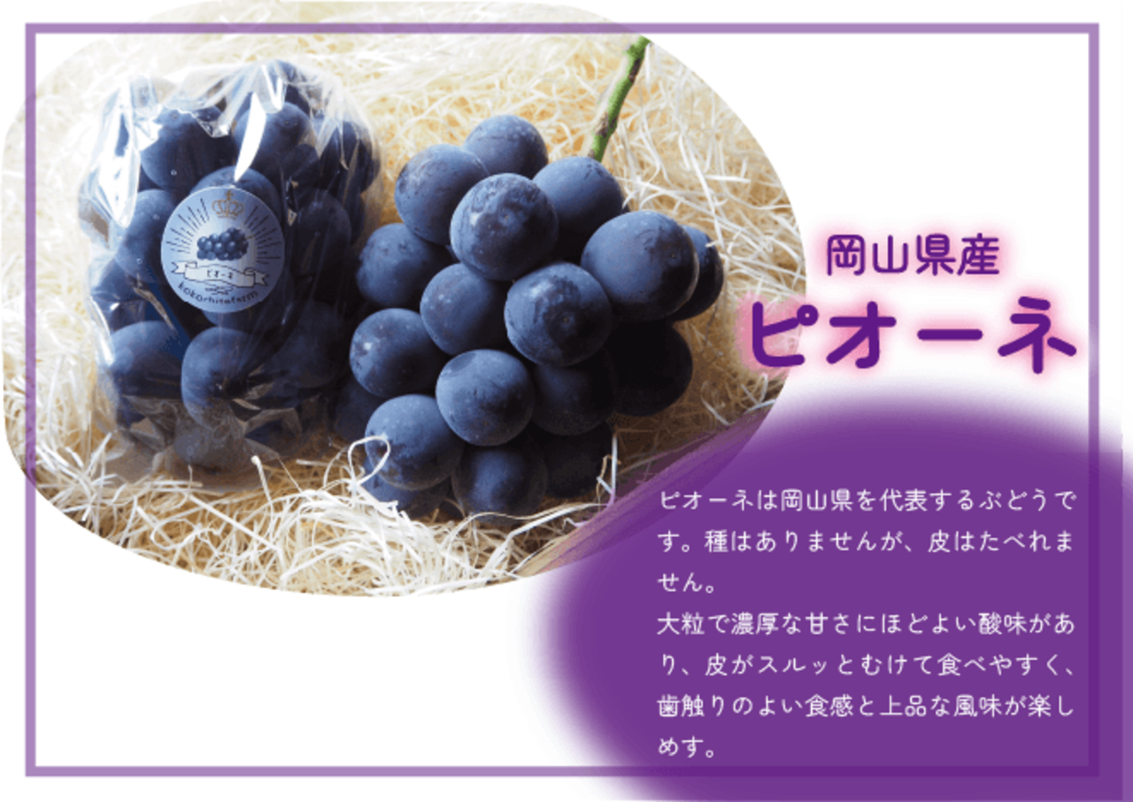 ピオーネは岡山を代表するぶどうです。大粒で濃厚な甘さにほどよい酸味があり、皮がスルッとむけて食べやすく、歯触りのよい食感と上品な風味が楽しめます。