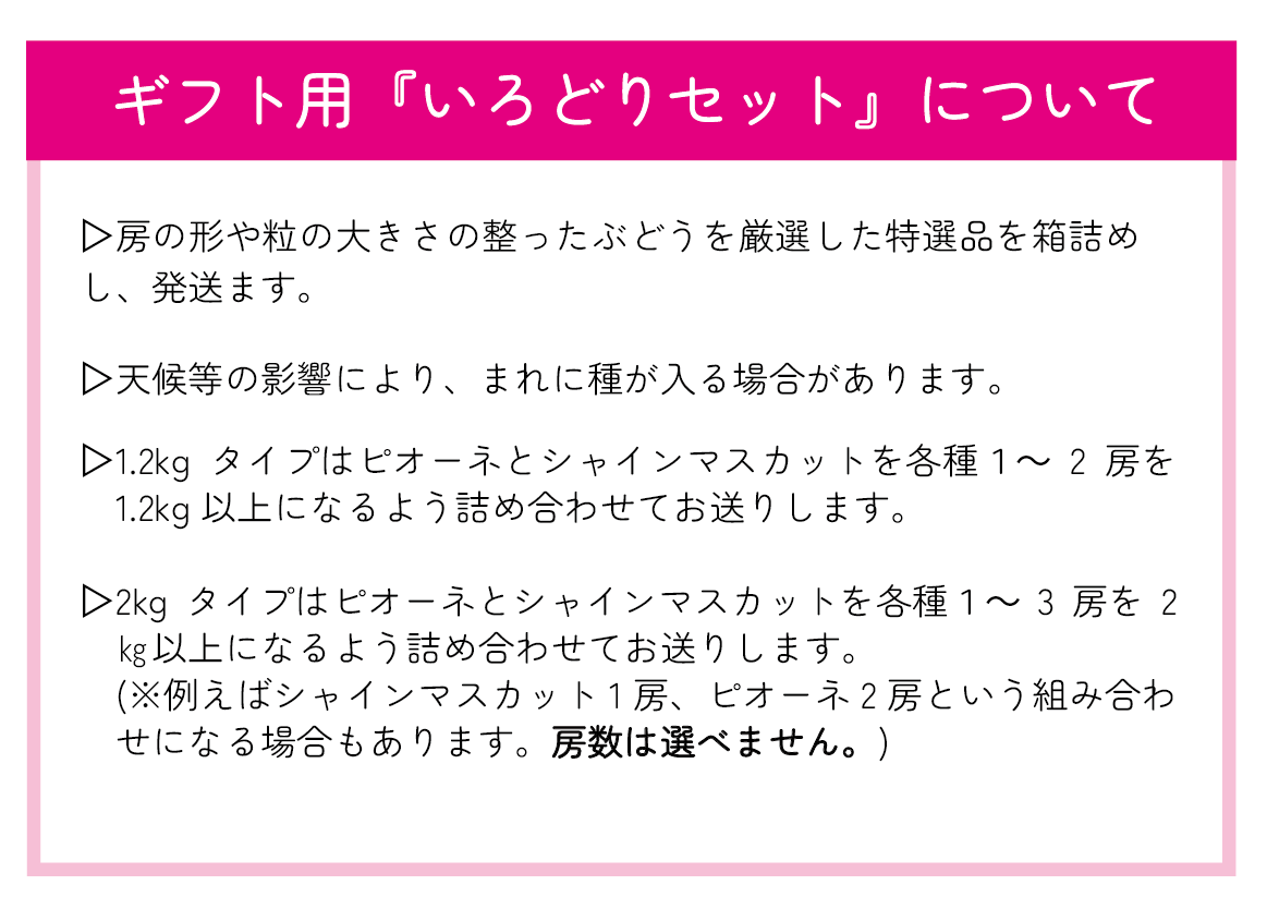 1.2㎏セット…シャインマスカットとピオーネ各種1~2房を1.2㎏以上になるように詰め合わせます。
